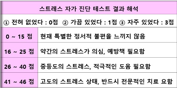 ④ 스트레스 자가 테스트 평가: 0 ~46의 척도를 사용하여 전반적인 스트레스 수준을 평가하십시오. 스트레스 수준이 지속적으로 높은 점수라면(26~46) 상당한 수준의 스트레스를 경험하고 있을 수 있습니다.
