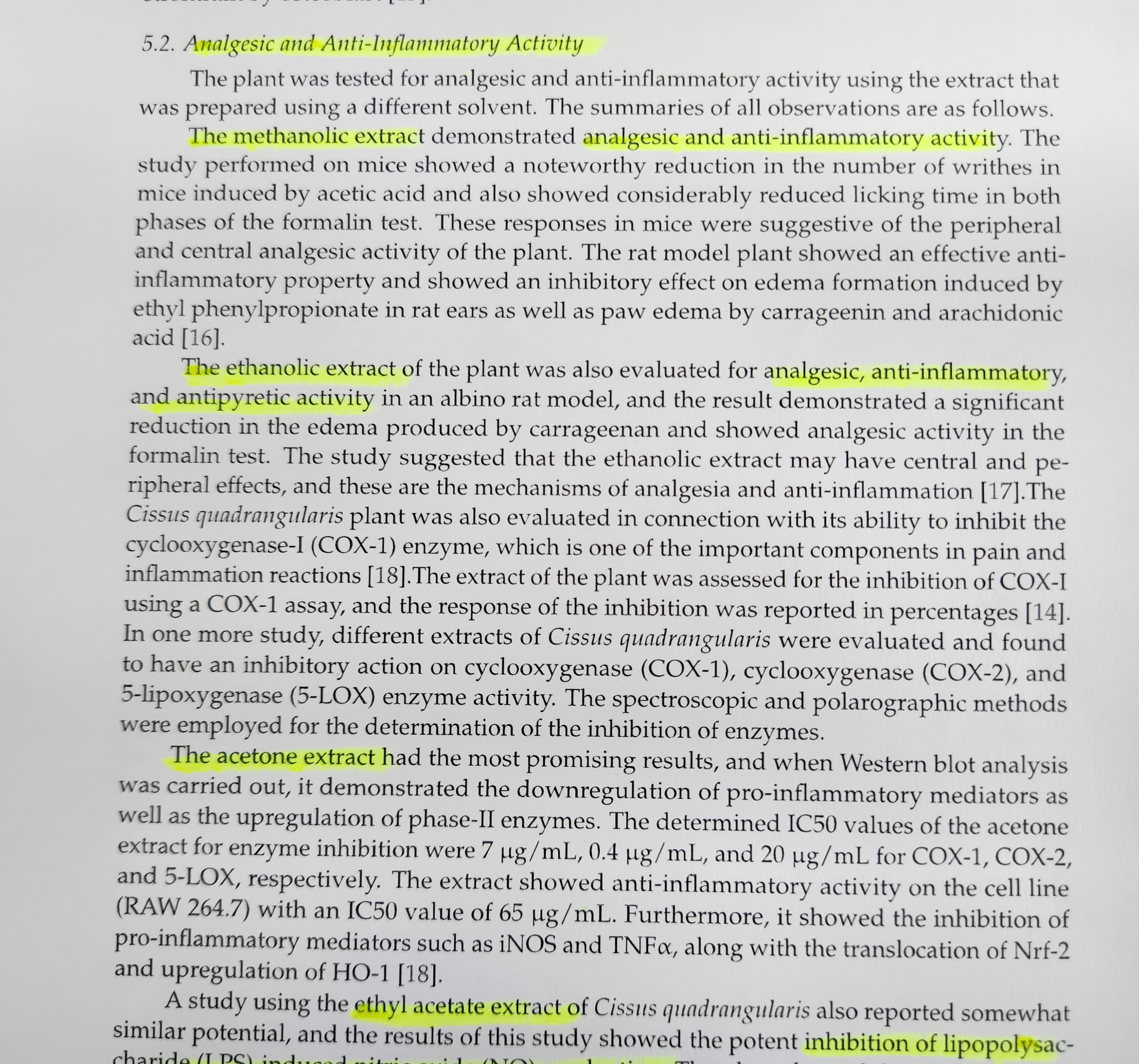 · 진통 및 항염 작용 : 시서스의 메탄올 추출물, 에탄올 추출물, 에틸 아세테이트 추출물, 아세톤 추출물은 다양한 연구 결과를 통해 진통 및 항염 작용에 효능이 있음을 나타냅니다.