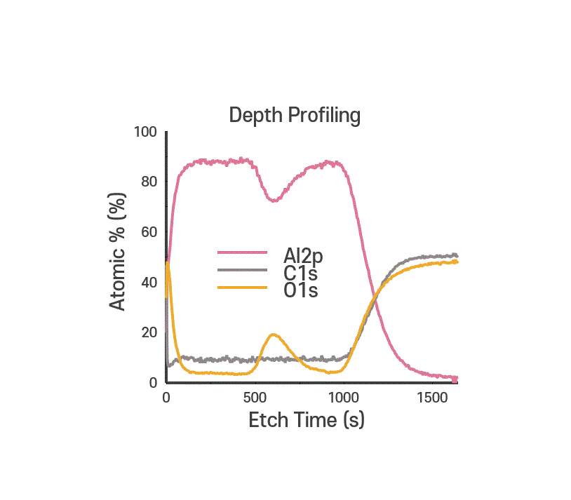 시료 표면에 아르곤 기체로부터 발생시킨 양이온을 충돌시켜 표면을 분당 수 nm씩 깎아내며 표면 깊이 방향으로 분석하는 방법입니다. 일반적으로 depth profiling이라고 부르는 이 분석법은 시료의 조성과 두께에 따라 파라미터 설정이 매우 다양하고 시간이 오래 걸립니다. 깊이에 따라 시료에 포함된 조성변화와 화학적 결합 상태 변화를 분석하기 때문에 다층 박막의 계면 상태와 산화수의 변화를 추적하는 데 매우 유용한 분석법입니다.