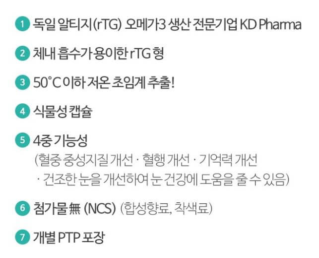 특징 : 알티지 오메가 3 생산 전문 기업 독일 KD Pharma 원료 사용