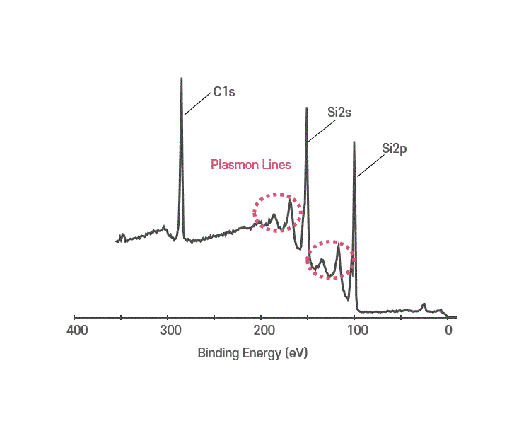 광전자로 방출되는 전자가 전도대(conduction band) 전자의 집단 진동을 일으키고 high binding energy 쪽에서 피크가 나타납니다. 금속의 경우 플라즈몬의 수명이 비교적 길어서 상당히 뾰족한 피크의 모양을 보이지만 반도체나 부도체의 경우 그 수명이 짧기 때문에 둔덕같이 보이며 종종 백그라운드처럼 보이기도 합니다.