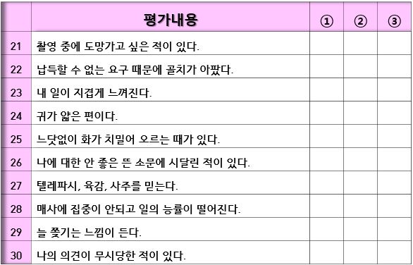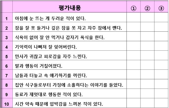 ② 감정 상태 평가: 스트레스는 또한 감정 상태에 영향을 미쳐 불안, 과민성, 우울증 및 압도감과 같은 증상을 유발할 수 있습니다.